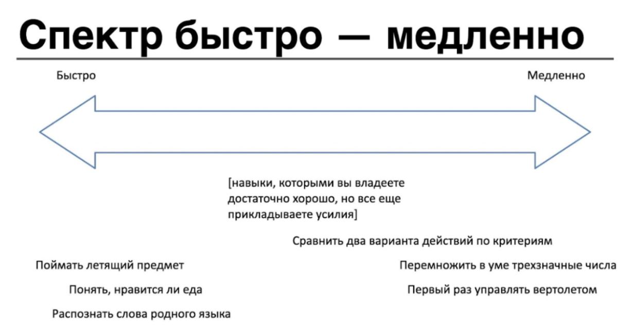 We supplement this model by saying that it is more of a spectrum of thinking speed rather than just a binary division into fast and slow, or more precisely, several spectra.