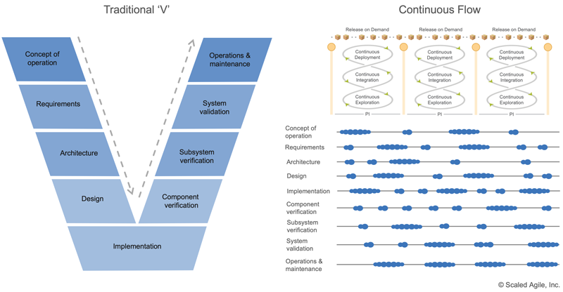 Don't expect that everything will be named uniformly everywhere. The practice of development organization as a separate practice is new, and the concept of the lifecycle is just beginning to fade. It can be difficult to understand the "work method" today. So names will vary. For example, in the SAFe development organization method[1], which is referred to as a framework, a scaling agile framework, SAFe, they define the transition to a continuous flow in the Enterprise Solution Delivery competence[2]. We can see that it discusses the organization of the development process and even shows traditional explanations of how the old "V-diagram" as a development method concept differs from "continuous flow" as a development method concept (we explain this V-diagram in detail in our courses, as you will encounter it in the most unexpected places, so you need to understand what it is trying to convey and what practice people are expressing when they draw it). However, it is not easy to visually recognize what came to replace it later, as there is a rare diversity. But upon closer inspection, you can see traces of the bumpy diagram, and even "requirements" are still among the practices).