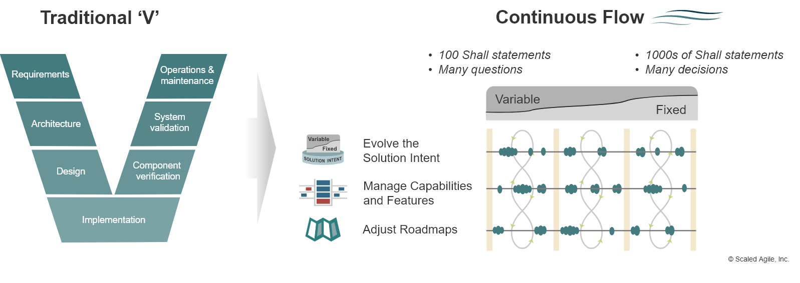 We can see that traditional practices are receding, and instead they discuss that out of hundreds of statements about the future system during continuous development (flow both in work and development, although often translated as "stream"), thousands of statements about what the system will be and a multitude of decisions accumulate as the process progresses. However, requirements are no longer present (though some references to them remain in other parts of the documentation, they are minor), leaving only "Evolve the Solution Intent" -- the gradual formation of the intention to have the final solution. This intention is never final (part of it is variable, meaning that some questions remain, and thousands of statements about what the solution will be never completely turn into a complete solution intention, questions persist).