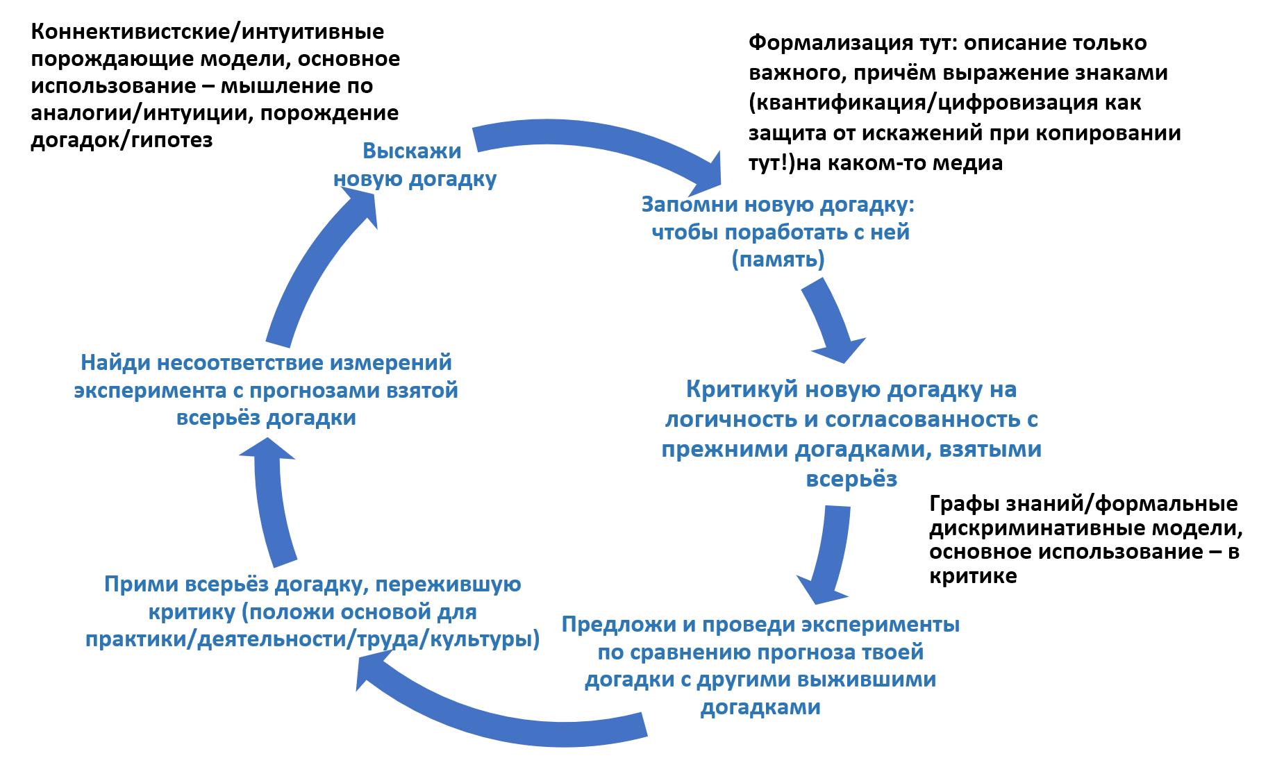 Next comes the cycle of quick generation of guesses and the laborious critique of them. During that, guessing/explanations/knowledge/theories are generated in the form of generative models --- future world states can be predicted based on these models, and criticism follows using discriminative models, on which class membership can be determined (thus finding the "logical contradiction"). In the picture is the cycle of cognition/creativity, which is explained in more detail in the course "Intellect-stack", although it's also explained without this picture. However, its various elements are discussed in various courses of the Systems Thinking School, here we'd only note that focusing on system objects/relations comes at the formalization step in the cycle: