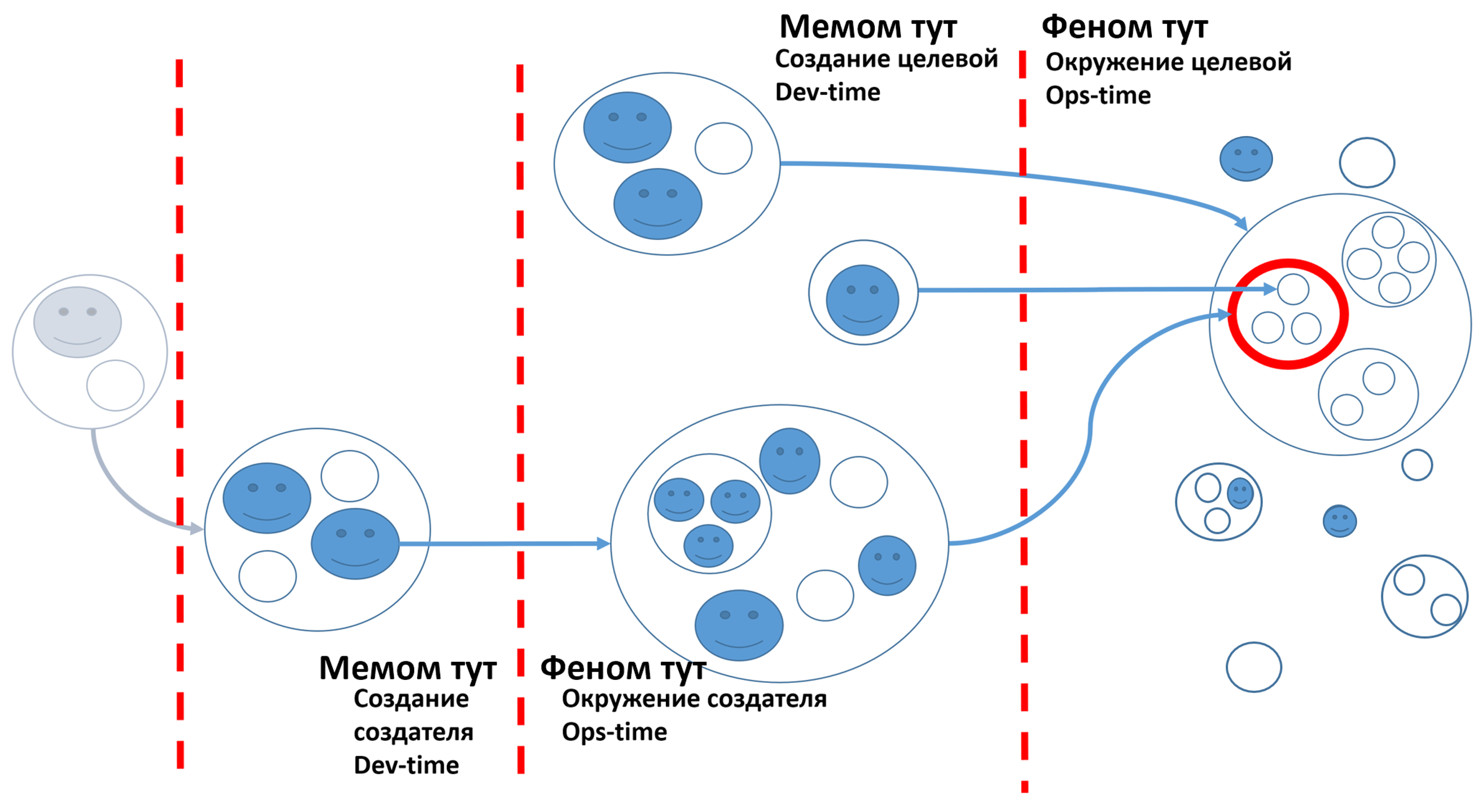 These creators create and develop (often by simply modifying the state rather than creating from scratch - like painting, adjusting, adding features, repairing) target systems, subsystems, and supra-systems of target systems. Creators in various project roles have diverse emergent characteristics of various systems at different system levels. Therefore, they try to design and predict the success of the target system based on emergent characteristics by making "smart mutations" during system development. In this process, they collectively edit the memome of the system during its creation and development. This is indicated by the term "meme here" during the creation time (we omitted the term "and development" for brevity, but development is often as important as creating MVP), opposite the term "phenom here."