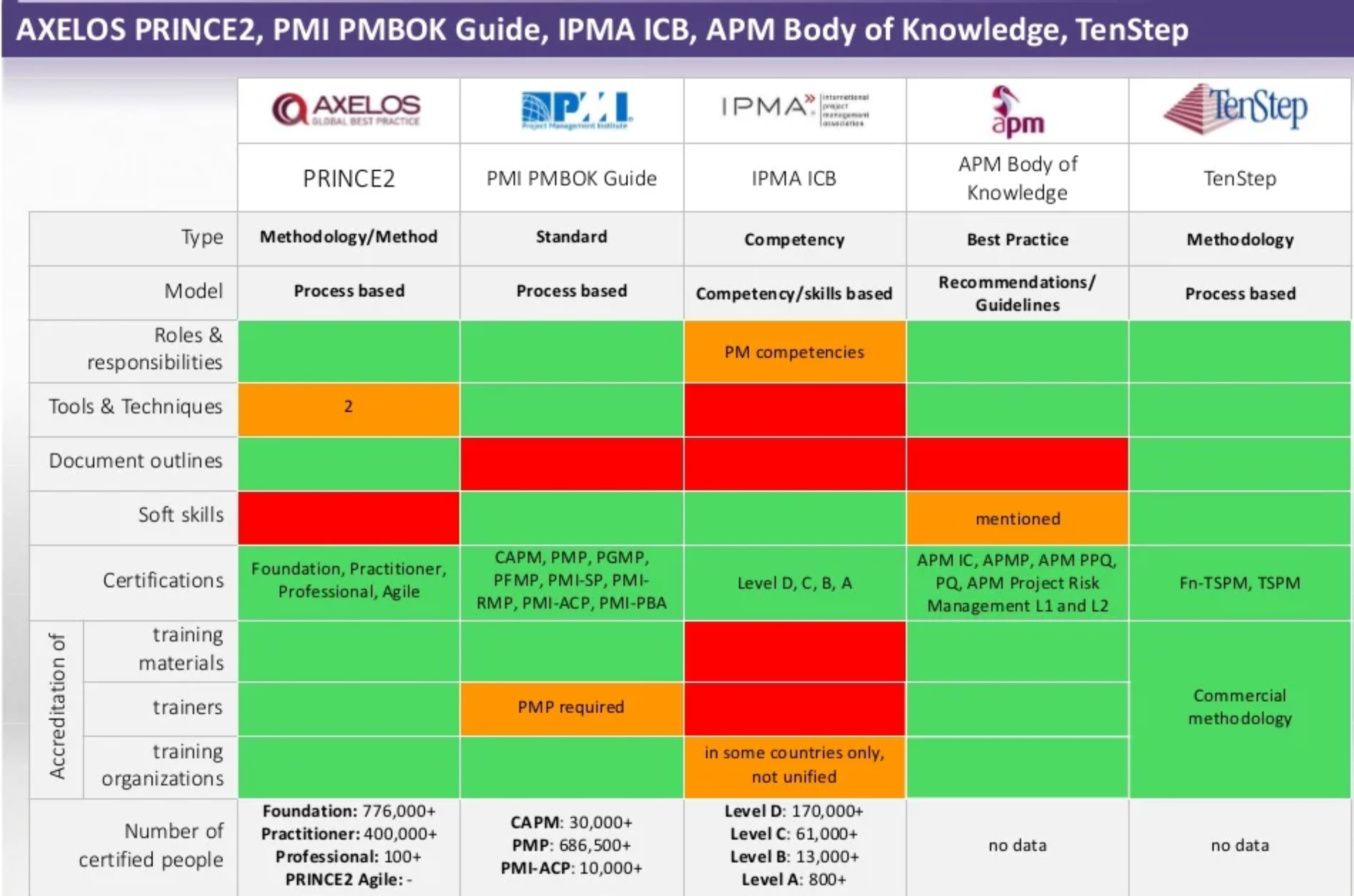 В области проектного управления конкуренция организаций, которые представляют собой «профессиональных управляющих проектами» ещё жёстче, там есть множество абсолютно разных вариантов практики, мастерство в работе по этим практикам сертифицируется, программы сертификации все разные. Вот сравнение нескольких таких организаций, поддерживающих разные версии практики проектного управления[3]: