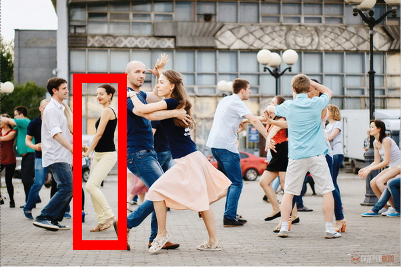 Попробуйте удержать во внимании фолловера::роль пары на дальнем плане, на картинке это указано красным прямоугольником. На картинке это легко, ибо красный прямоугольник помогает вам управлять вниманием. Если его убрать, ваше внимание наверняка будет отвлечено партнёром пары на переднем плане: он смотрит прямо вам в глаза, ближе и крупнее, и сильно отвлекает! Теперь включите звук (там же шумно!) и из статичной картинки представьте, как это происходит в жизни (все стали быстро двигаться, крутиться, заслонять друг друга). Красного прямоугольника, помогающего удержать внимание, в жизни нет. Сколько секунд в жизни в реальной ситуации вы можете удерживать полное внимание на том фолловере, который на картинке обведён красной рамкой?