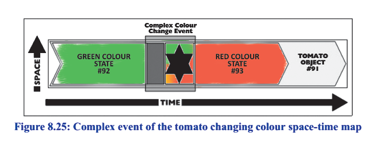 Все три измерения пространства на этой диаграмме показывают на одной оси, а время на другой оси. Помидор (экземпляр помидора #91, речь ведь идёт об объектах-индивидах в физическом мире, а не типах) занимает какое-то пространство-время (тип не может занимать место в пространстве-времени, только экземпляры из физического мира могут занимать пространство-время), а внутри него находятся индивиды-состояния зелёного помидора, красного помидора и сложное событие изменения цвета помидора.