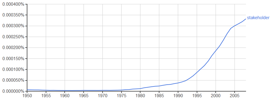 Вот график частоты упоминания слова stakeholder в библиотеке англоязычных книг Гугла[3], и это примерно отражает распространение системного подхода в его второй версии (прежде всего в литературе по проектному управлению, ибо там первыми начали говорить про людей в системах-создателях, а затем в системной инженерии. Проектное управление как метод менеджмента тоже появилось как приложение системного мышления к менеджменту, как и системная инженерия появилась как приложение системного мышления к инженерии):