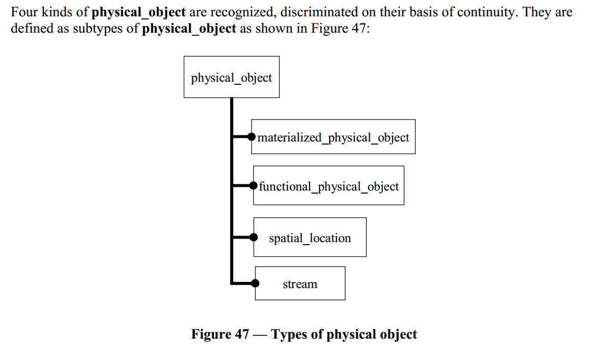 Более того, в ISO 15926-2:2003 пространственное место (spatial_location) --- это тоже физический объект, в силу 3D экстенсионализма. Как функциональный объект определяется на базе устойчивости назначения/поведения, как конструктивный/материальный объект определяется на базе устойчивости наличия материала, так и пространственный объект определяется на базе устойчивости места. И отдельно выделяется ещё один материальный объект, который в инженерии важен, но который трудно определить через постоянство материала, места и назначения: поток/stream, в потоке важно постоянство его пути/flow_path.