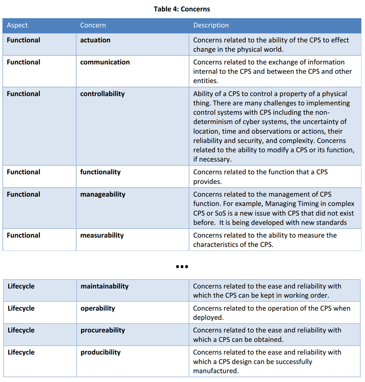 В публичном документе (публичный документ отличается от стандарта только тем, что не предусмотрена процедура проверки на соответствие) CPS PWG Cyber-Physical Systems (CPS) Framework Release 1.0[1] приведена более полная, чем в ISO 42010 таблица предметов интереса для киберфизических систем, то есть систем, в составе которых есть датчики, эффекторы и управляющий ими универсальный-по-Тьюрингу компьютер. В этом публичном документе (выпущен в мае 2016 года) ввиду большой длины списка характеристик, они разбиты на группы, отражающие аспекты/aspects: функциональный, организационный, человеческий, доверия, времени, данных, границ, состава, жизненного цикла (functional, business, human, trustworthiness, timing, data, boundaries, composition, lifecycle).