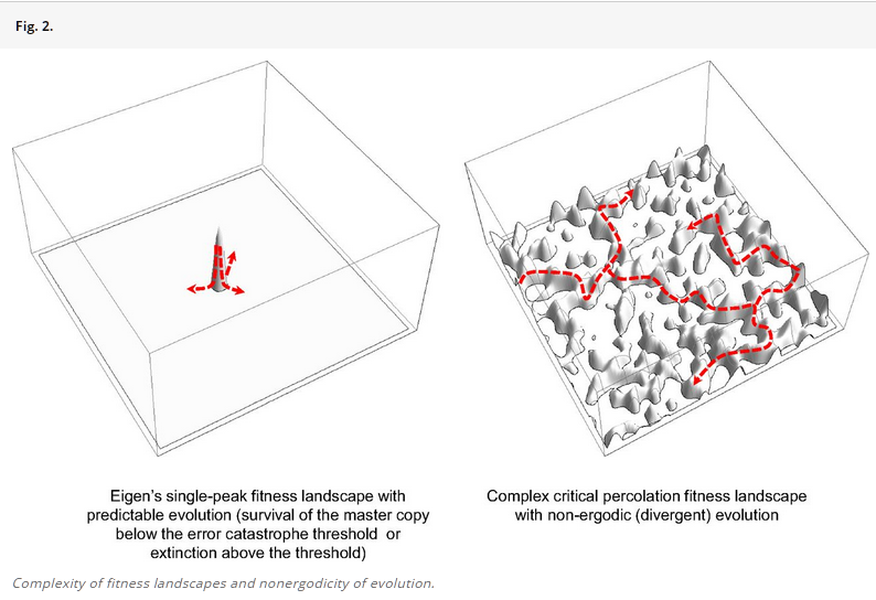 Она показывает, что у эволюционирующих систем в каком-то определённом смысле есть память (физики говорят про системы с памятью «не эргодические[7]», они не хаотично блуждают по всем своим состояниям), они запоминают конфигурацию «оптимума выживания». Но в реальной ситуации память не запоминает найденное конфигурационное решение намертво, ибо существует очень много разных конфигураций системы, у которых примерно одно и то же квазиоптимальное «соответствие нише»/fitness, между которыми очень маленькая разница в «оптимальности». Конечно, есть самые разные конфигурации систем, которые не смогут выжить, и их большинство, но и конфигураций, в которых системы выживут, предостаточно, и они очень мало отличаются друг от друга.