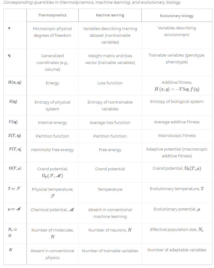 Посмотрите пример таблицы, которую сделали на базе сравнения похожести математических описаний в термодинамике, теории нейронных сетей (глубокое обучение/deep learning) в машинном обучении и теории эволюции[15]: