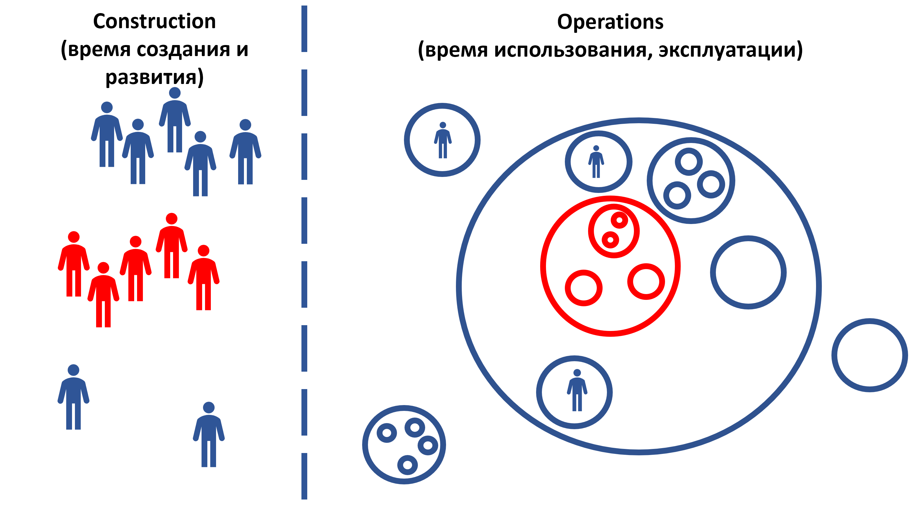 Внешние проектные роли времени использования показаны синими человечками, но это не люди. Это роли, исполнять их могут и люди, и люди с компьютерами, и команды, и фирмы со всеми их людьми и оборудованием. В рассмотрении operations такие внешние роли, например, «пользователи», при этом мы рекомендуем общий тип «пользователь» нашей мета-мета-модели всегда заменять на тип роли из мета-модели (предметной области целевой системы) --- в играх это игрок::пользователь, в бухгалтерских системах бухгалтер::пользователь и аудитор::пользователь. Но внешними проектными ролями могут быть и вредители/хакеры, и инспекторы внешних надзоров --- кто угодно, кто взаимодействует с целевой системой в operations time. Эти роли показаны в кружках, чтобы подчеркнуть, что это тоже системы в окружении (роль --- ролевой объект, который играется каким-то агентом как конструктивным объектом).